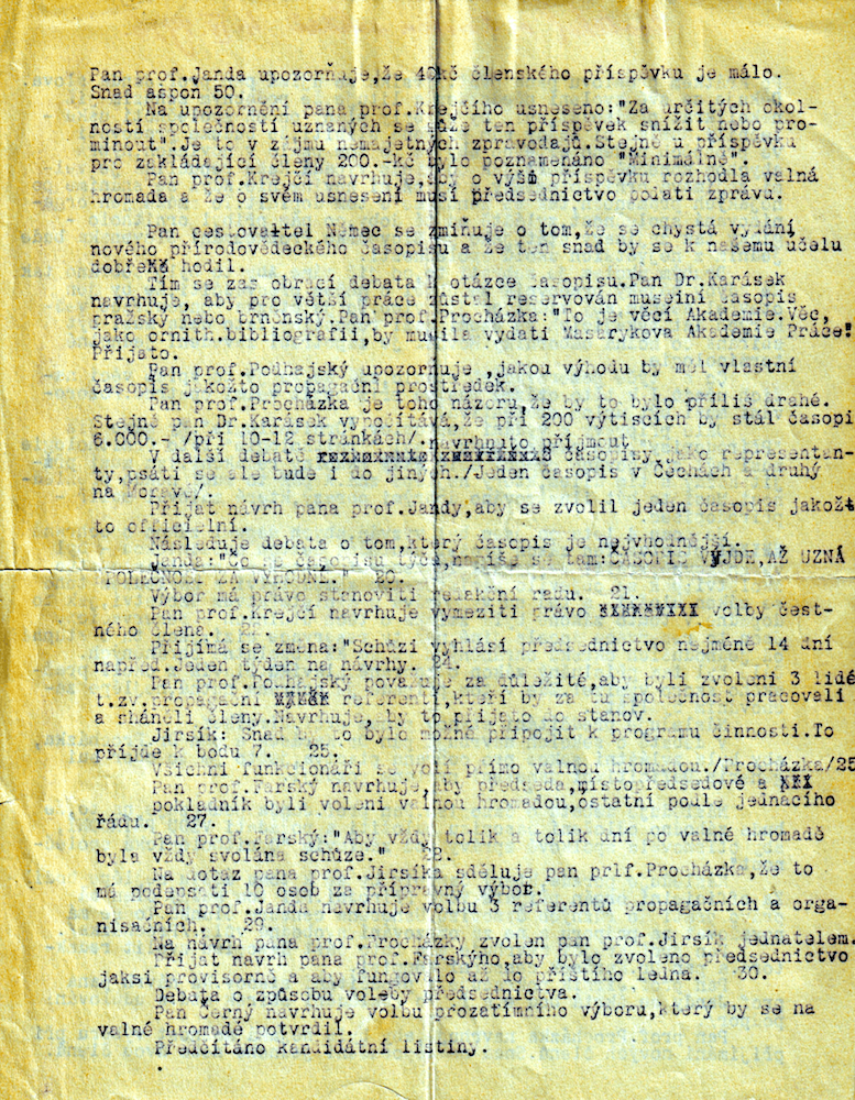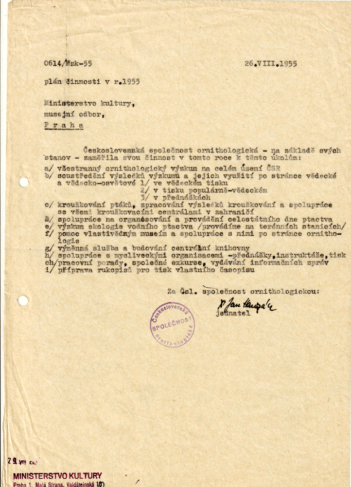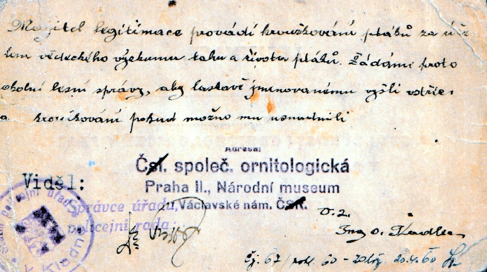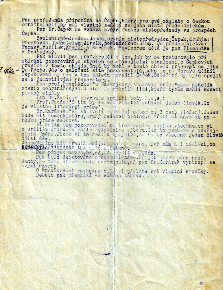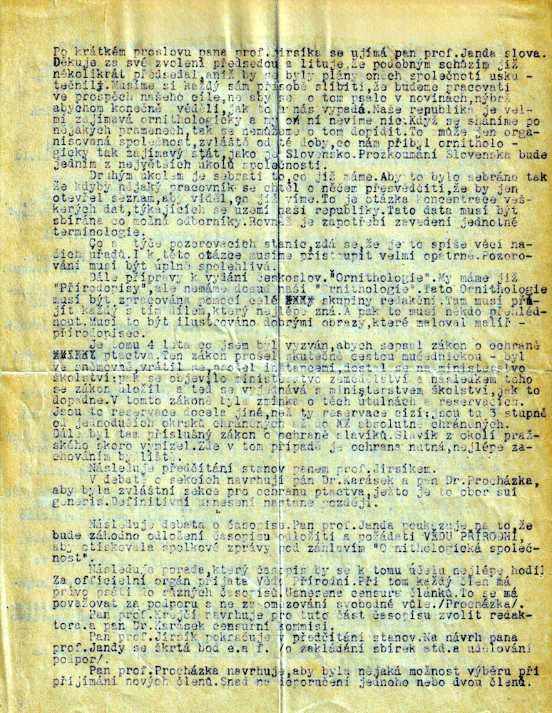 „Počátky naší společnosti dlužno hledati vlastně již v roce 1926, kdy ozvalo se volání několika nadšených jednotlivců, aby všichni čeští ornitologové sdružili se ve spolek, jehož úkolem by byl ornitologický výzkum naší republiky…. Výsledkem této snahy byla pak schůze přípravného výboru, svolaná o velikonocích roku 1926 do Prahy. V restauraci “U Bumbrlíčka” sešlo se nás pár nadšenců, lehce by nás byl spočítal na prstech obou rukou. Málo jsme se znali osobně, proto s určitým ostychem a nedůvěrou pohlíželi jsme jeden na druhého, ale mnoho plánů, ani nedomyšlených, měli jsme ve svých hlavách.“