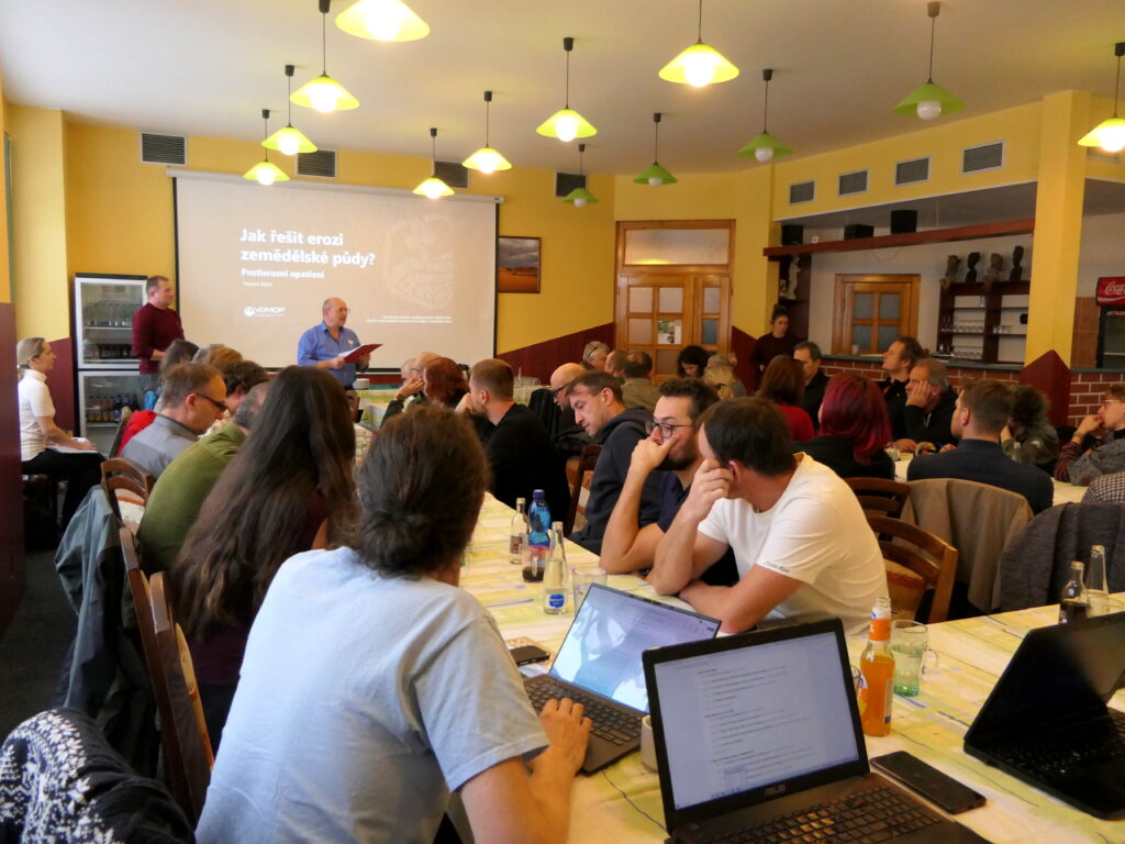 Moderátor konference Jaroslav Pražan a Martin Mistr z VÚMOP během přednášky o možnostech a metodách boje s erozí. Foto: Michaela Kadavá