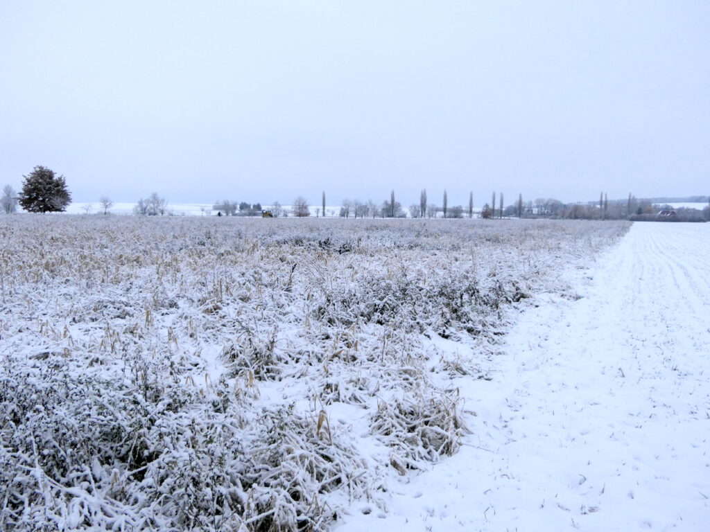 Při vycházce za koroptvemi v prosinci 2022 jsme objevili toto políčko nesklizené kukuřice. Zajímavé se ukázalo být nejen pro nás, ale i pro přítomné koroptve a drobné zrnožravé ptactvo. Foto: Michaela Kadavá
