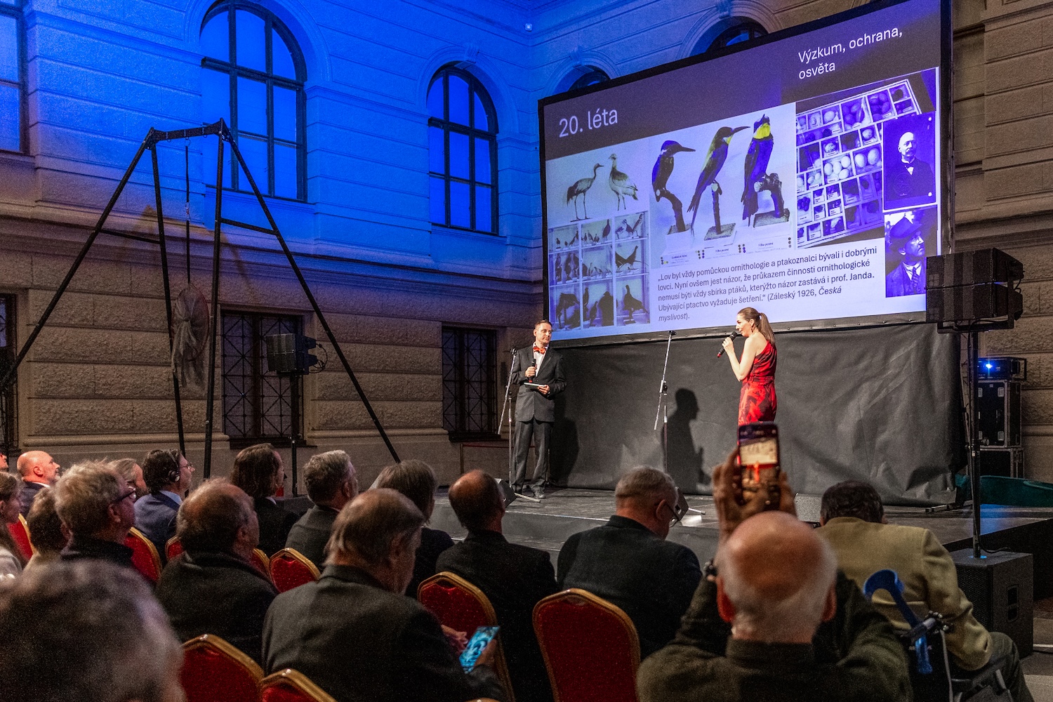 Alena Klvaňová z ČSO s Romanem Slobodníkem ze SOS představili důležité milníky ve stoleté historii Československé ornithologické společnosti – od založení v dubnu 1926 v pražské restauraci U Bumbrlíčka na Národní třídě, přes rozloučení se slovenskými přáteli v 80. letech (přejmenování na Českou společnost ornitologickou a vznik Slovenské ornitologické spoločnosti) do současnosti, kdy jsou obě organizace silné a samostatné.