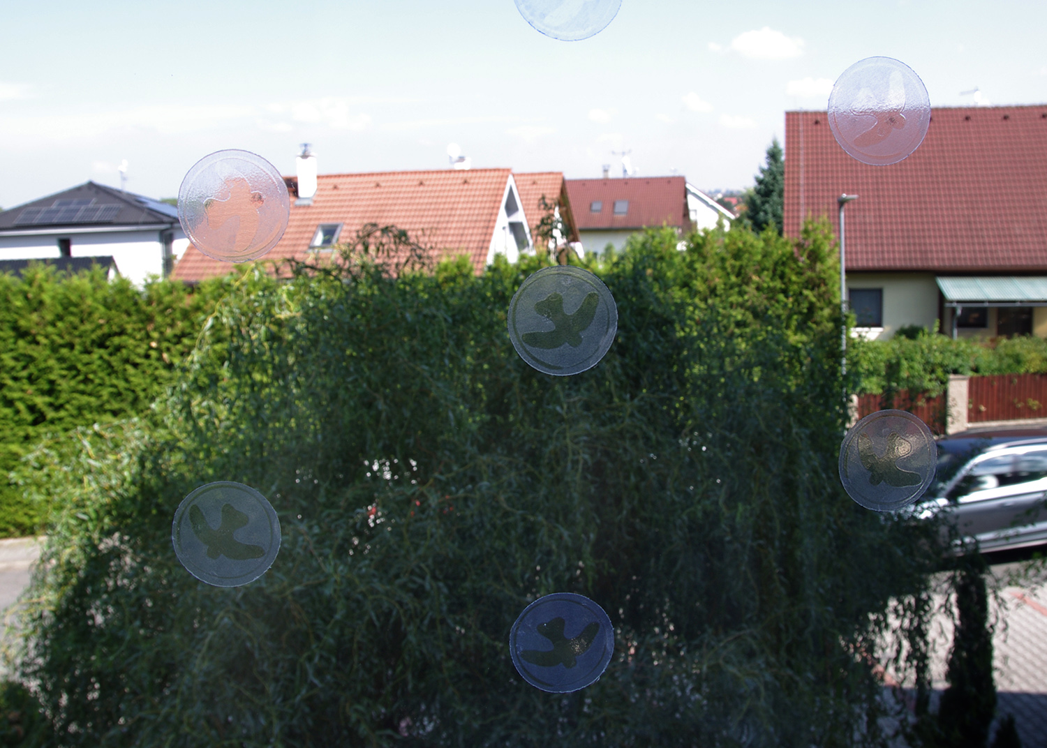 Jedna silueta dravce na skleněné ploše je nefunkční způsob zabezpečení. Nepohybující se silueta není pro ptáky reálnou hrozbou, jen pevným objektem, kolem kterého se snaží proletět. Ze všeho nejdůležitější je zajistit, aby ptáci měli možnost včas si prosklených ploch všimnout a bezpečně se jim vyhnout. K tomu slouží například barvy na sklo, samolepící fólie nebo samolepky nejrůznějších tvarů, barev i motivů – klidně i dravců, ale musí být maximálně 10 cm od sebe a z vnější strany, jinak by v případě zrcadlení nebyly vidět. Vhodné samolepky (včetně UV) najdete v Obchodě ČSO.