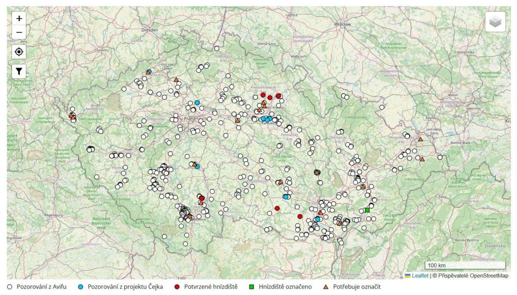 Obec (část obce). Zadáním tohoto údaje se Vám přiblíží mapka do požadované oblasti, kde poté snadno dohledáte polohu hnízdiště.