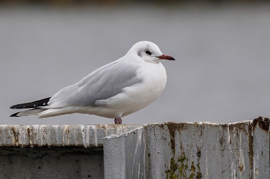 Dospělý racek chechtavý v prostém šatě nemá černou hlavu.