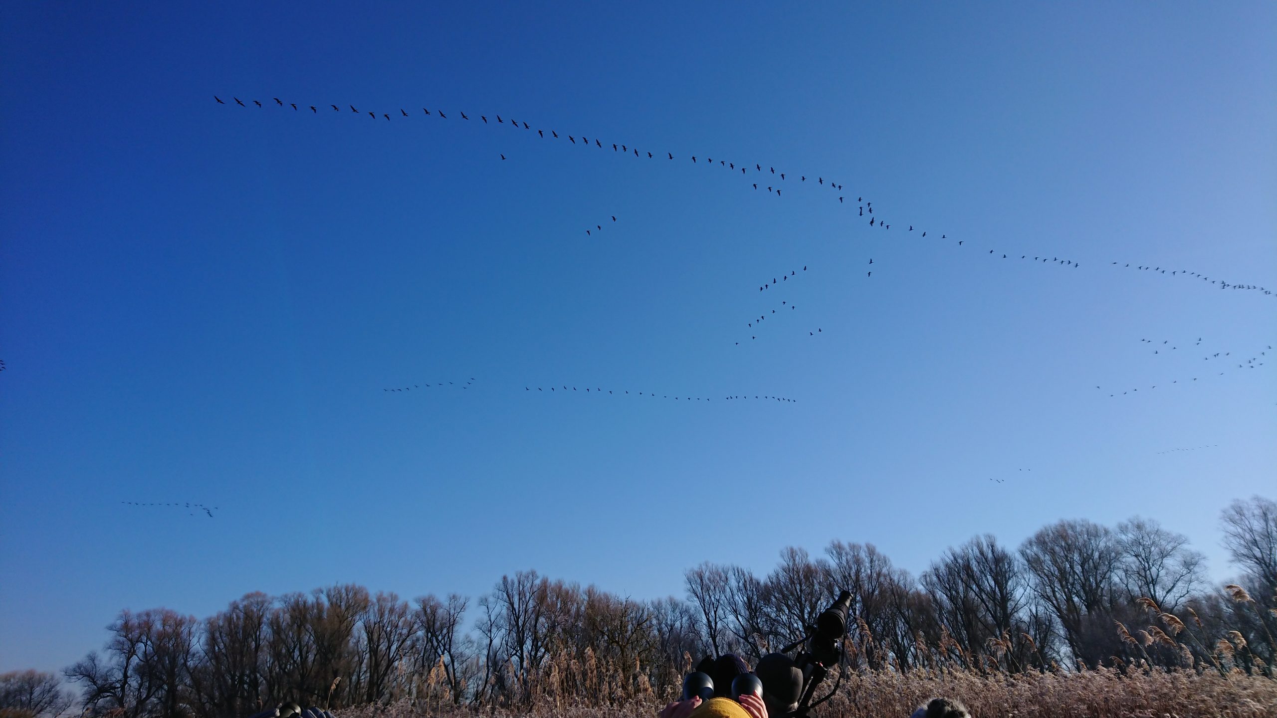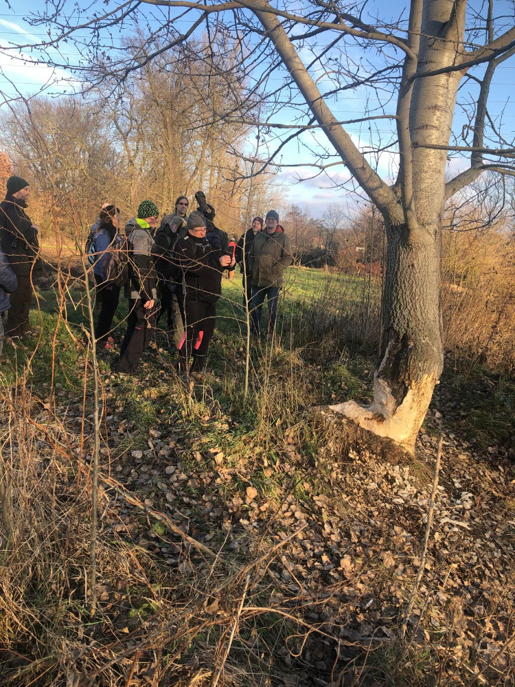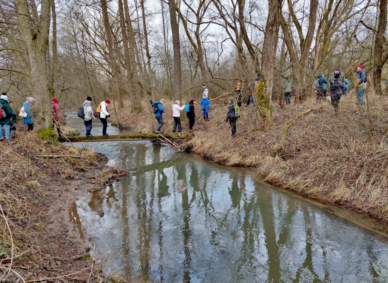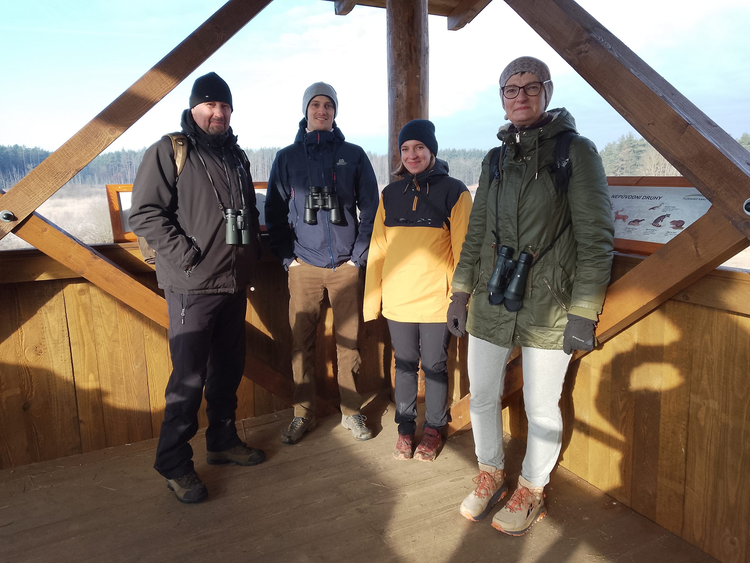 Na Janovském mokřadu byla vycházka komorní, ale zato velmi povedená. Účastníci si užívali slunečného počasí i pozorování jeřábů popelavých. Foto: Jana Lopatová
