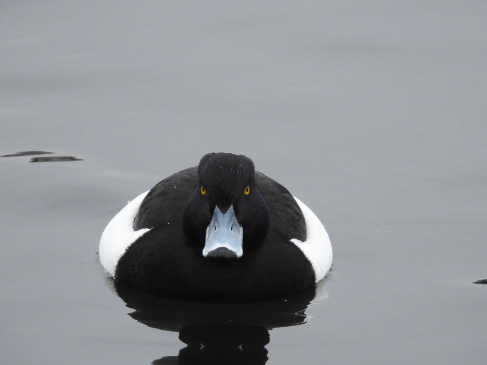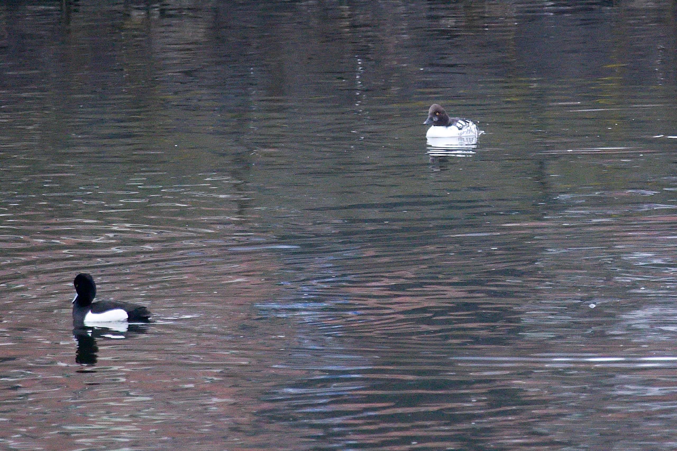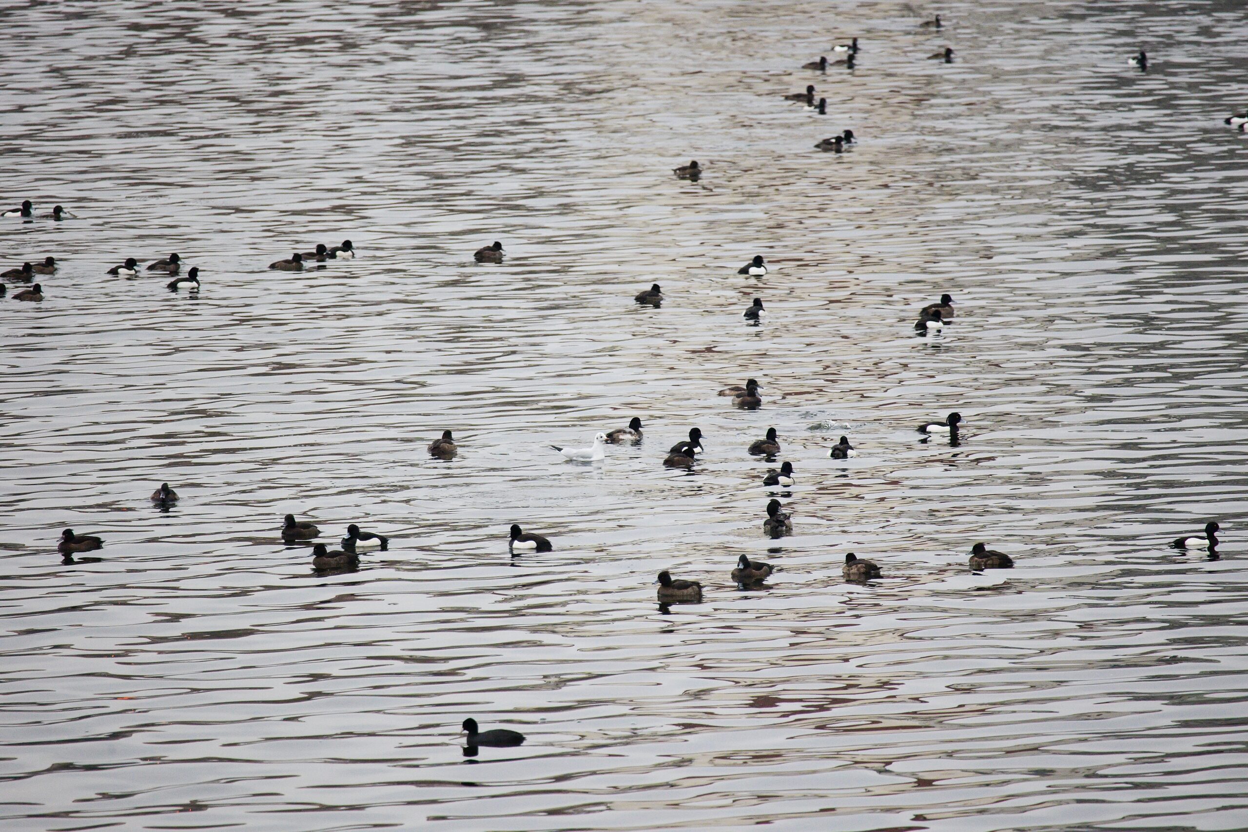 A že zde bylo opravdu co pozorovat! Na pražské Vltavě se mezi početnými poláky chocholačkami skrýval i vzácnější polák kaholka (na snímku vedle racka). Foto: P. Martínek