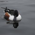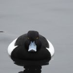 Ozdobou zimních řek je i hohol severní (nahoře). Na fotografii je přepeřující sameček, kterému se již rýsují bílé boky a skvrna na líci. Foto: P. Martínek