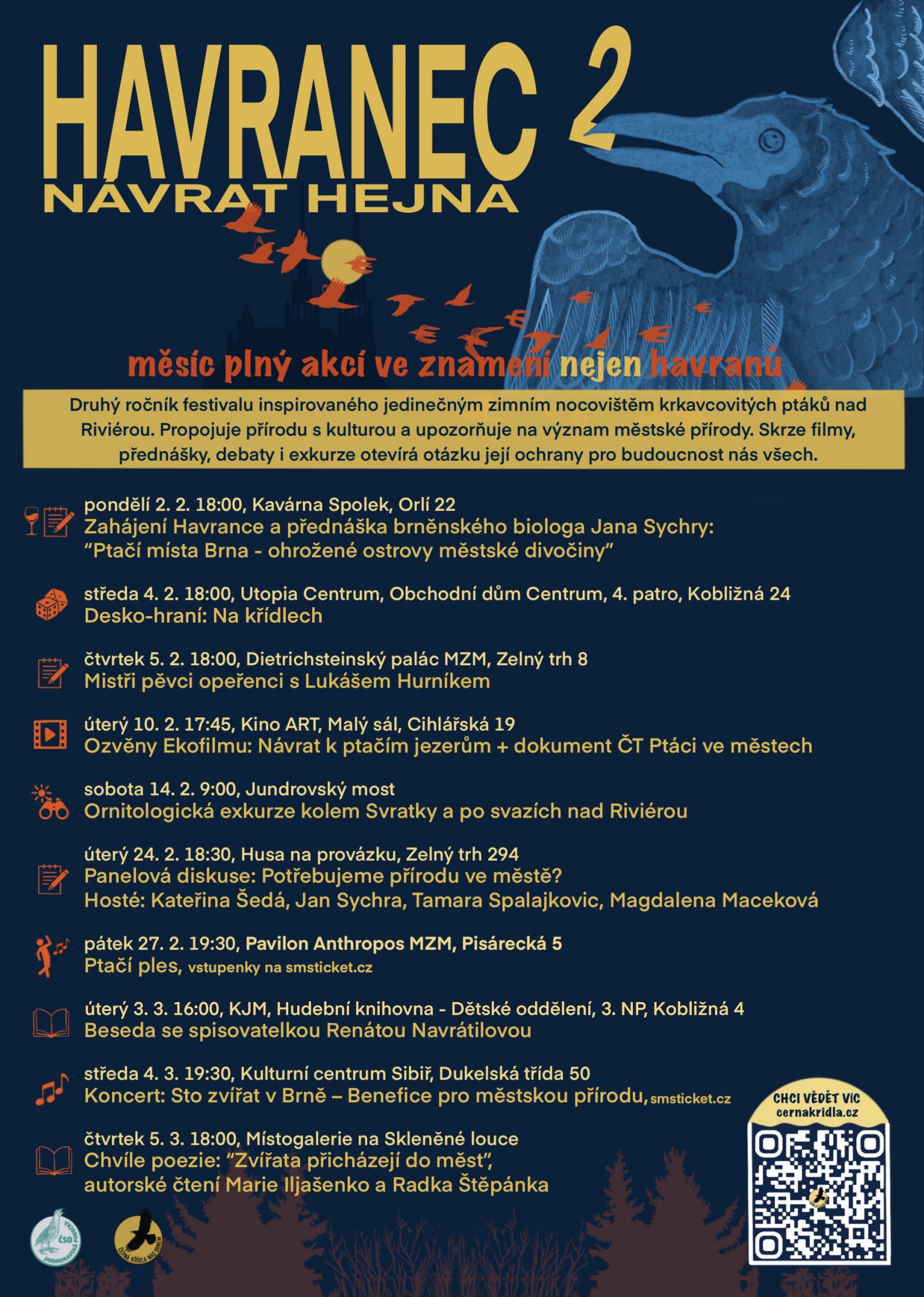 Ve druhém týdnu Havrance proběhne filmový večer Ozvěny Ekofilmu v úterý 10. února, v rámci něhož promítneme nový dokument České televize Ptáci ve městě natáčený v Brně a slovinský dokument Návrat k ptačím jezerům. Na něj naváže terénní exkurze v sobotu 14. února podél řeky Svratky a kolem svahů nad Riviérou, během které Jan Sychra a Marie Hejsková představí zdejší ptačí obyvatele.