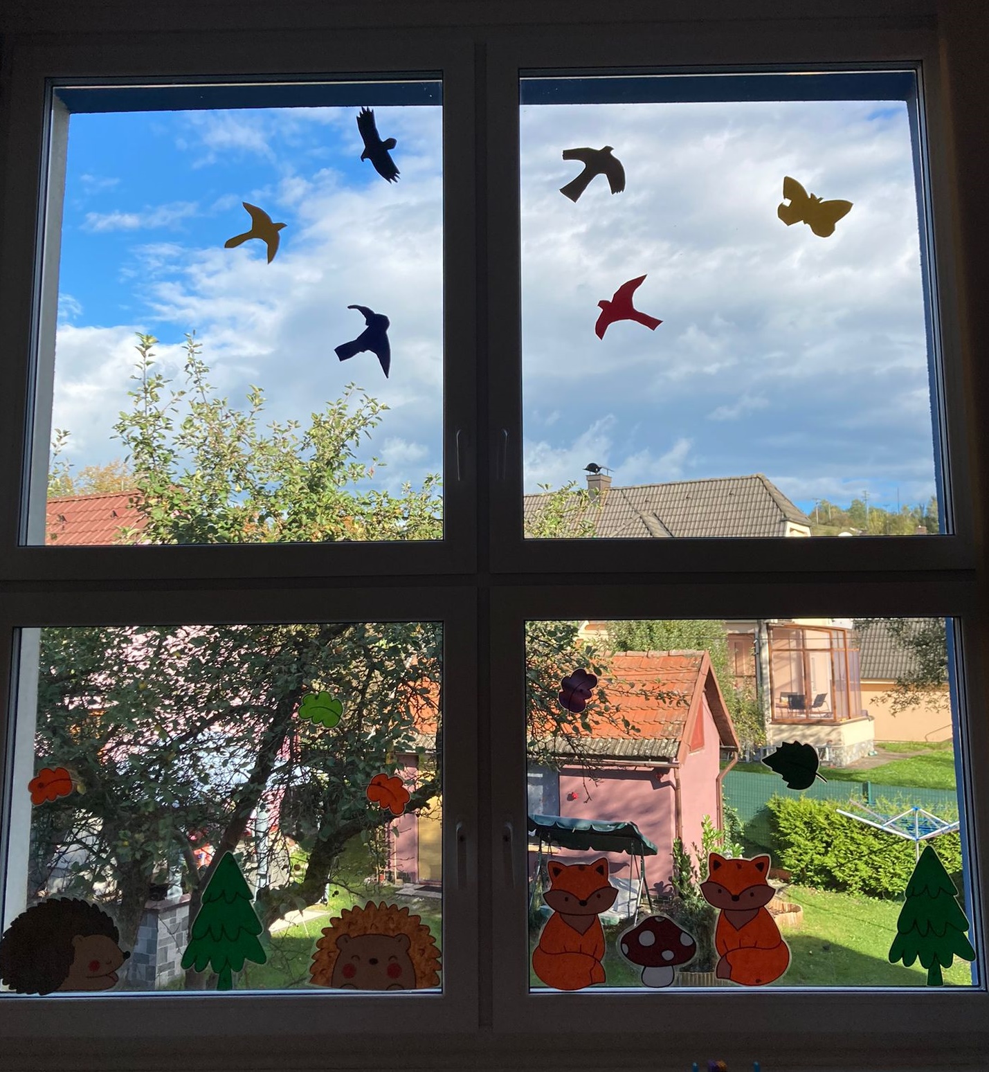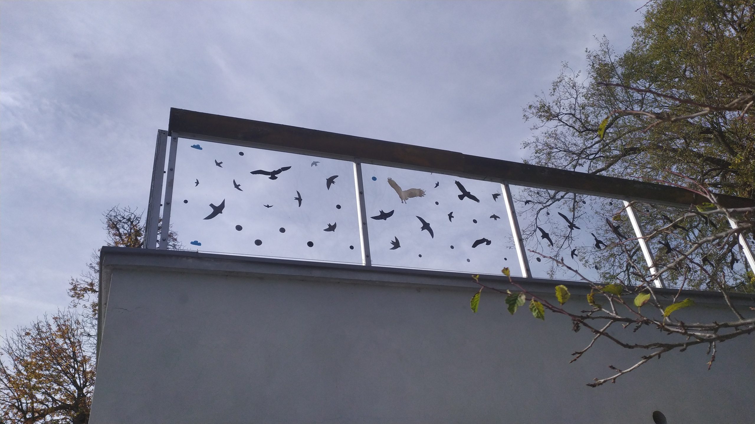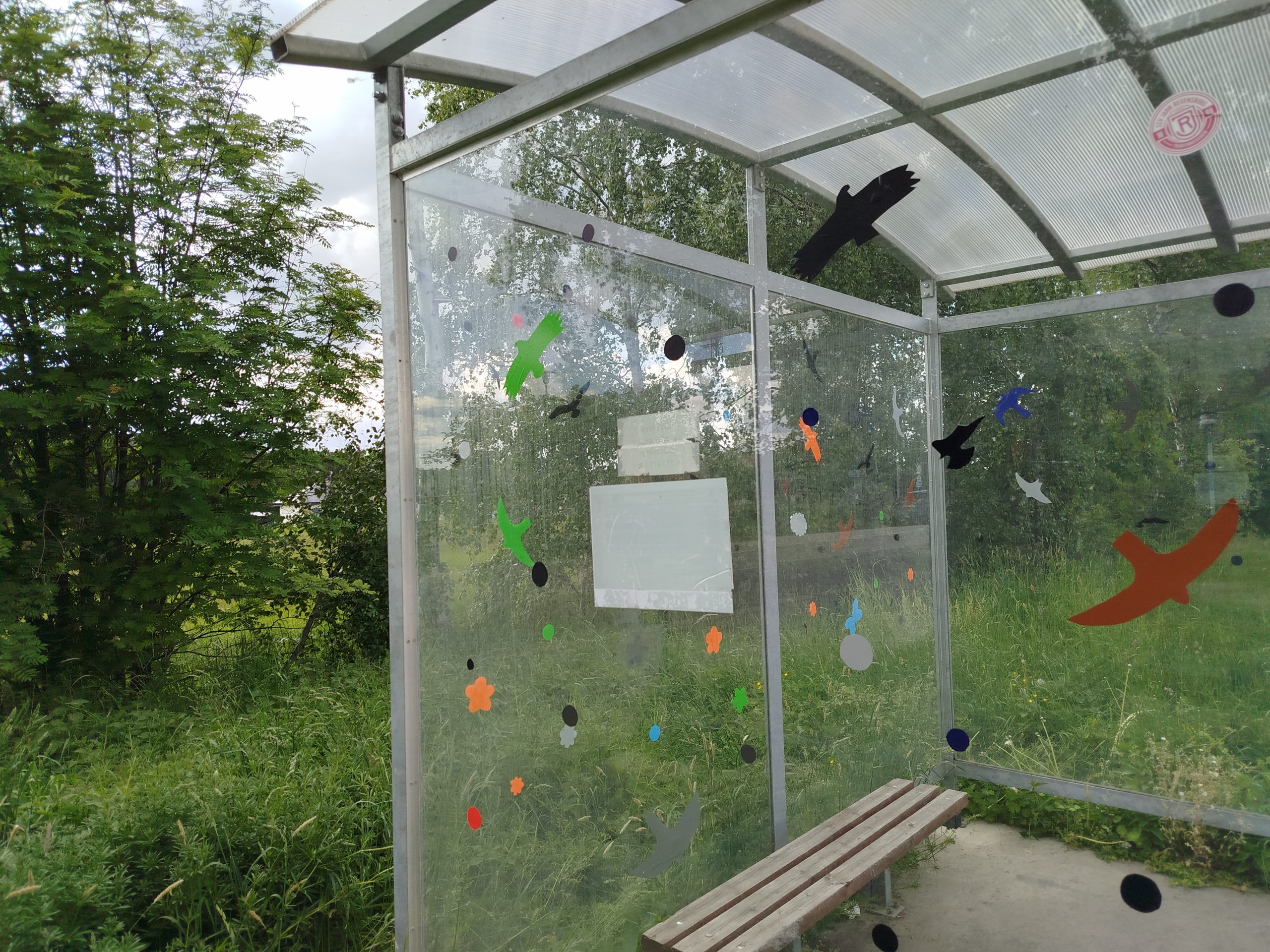 Na začátku byl mrtvý strakapoud. Další oběť špatně polepené skleněné plochy jedné zastávky (ano, siluety na ní byly, ale jen dvě). V tu chvíli jsme měli jasno. Rozhodli jsme se se skupinou dětí, samozřejmě po řádném pohřebním obřadu s květinami, že s tím něco uděláme. Oznámili jsme zástupcům obecního úřadu, že prostě plochu polepíme a děti začaly vystřihovat z barevné fólie ptáčky, kytičky, mráčky, cokoli. I ony totiž věděly, že na tvaru nezáleží, ale na vzdálenosti jednotlivých nálepek ano. Mají být od sebe asi jako, když se položí dospělá dlaň.
