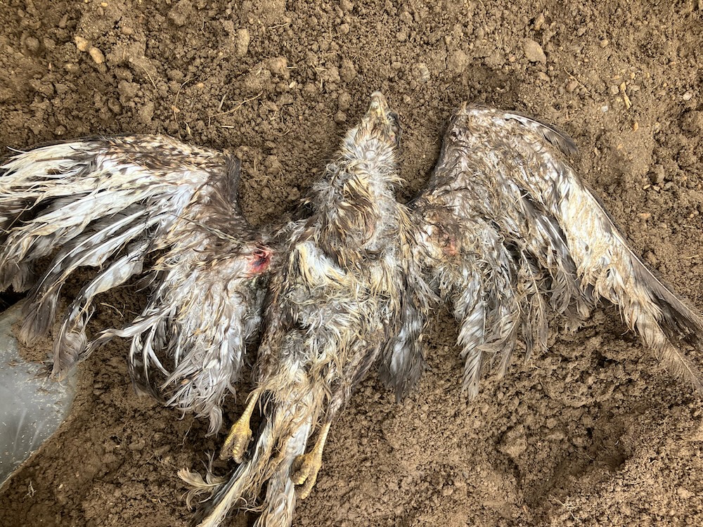 - mrtvé zvíře v typické pozici (ptáci: křečovitě sevřené pařáty, roztažená nebo poloroztažená křídla; šelmy: leží na boku, natažené nohy, otevřená tlama, někdy hlava zvrácená dozadu)