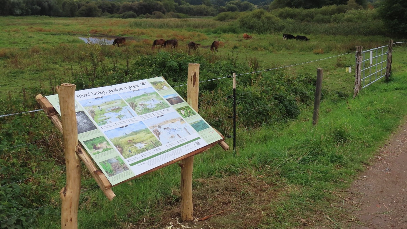 Nivní louky, v současné době na některých místech parku dlouhodobě neobhospodařované a vegetačně degradované, tvoří hlavní část ptačího parku a je na ně zaměřena největší část péče. Proto jsme na Mnišských loukách začali v roce 2023 s pastvou velkých kopytníků, která velkou měrou přispěla k návratu čejek chocholatých do tohoto území a podporuje obnovu jejich historické pestrosti. Proto je i právě pastva součástí naučné cedule o nivních loukách, která je tak umístěna přímo u samotné pastviny exmoorských koní.