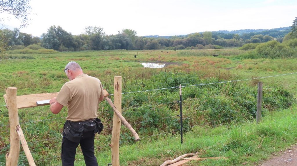 Příprava dřevěného stojanu pro ceduli pojednávající o nivních loukách. Foto: Josef Rutterle