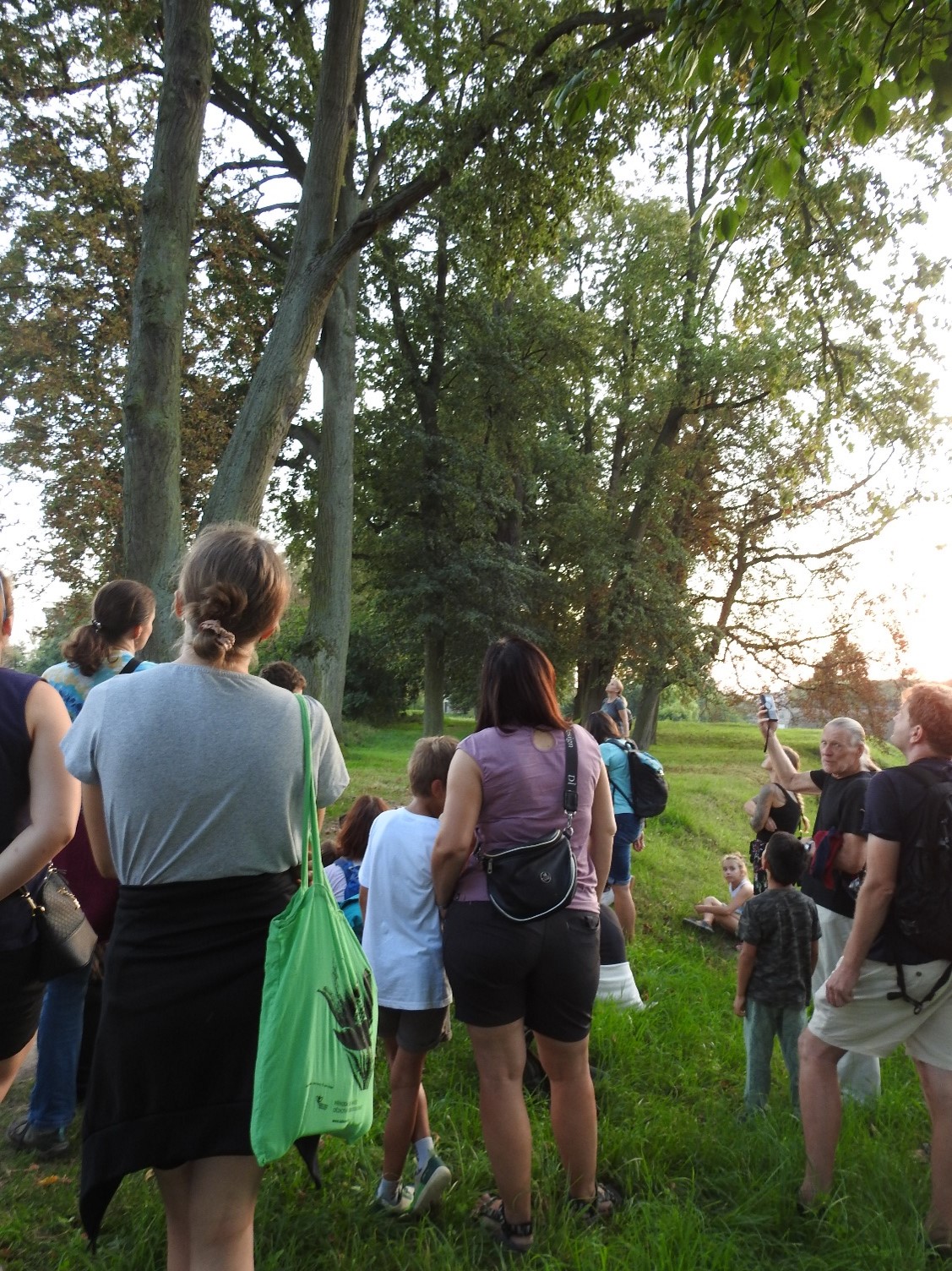 Následoval průchod běžně nepřístupnou poternou (tj. historicky výpadová chodba pro vojska Pevnosti Josefov) k vnějšímu opevňovacímu prvku pevnosti Ravelinu XVI, v jehož labyrintu podzemních chodeb jsme pozorovali tři vrápence malé, netopýří symbol josefovské pevnosti. Po promenádě na okraji netopýří metropole s velkým množstvím doupných lip jsme se přesunuli k ptačímu parku. Po cestě jsme udělali krátkou zastávku u dutiny, kterou osidlují netopýři rezaví. Očekávali jsme hromadný výlet netopýrů, ale nakonec jsme se dočkali pouze jednoho z nich. Naštěstí jsme mohli sledovat i množství jiných netopýrů rezavých už lovících na obloze, které jsme zaznamenávali i pomocí detektoru netopýrů.