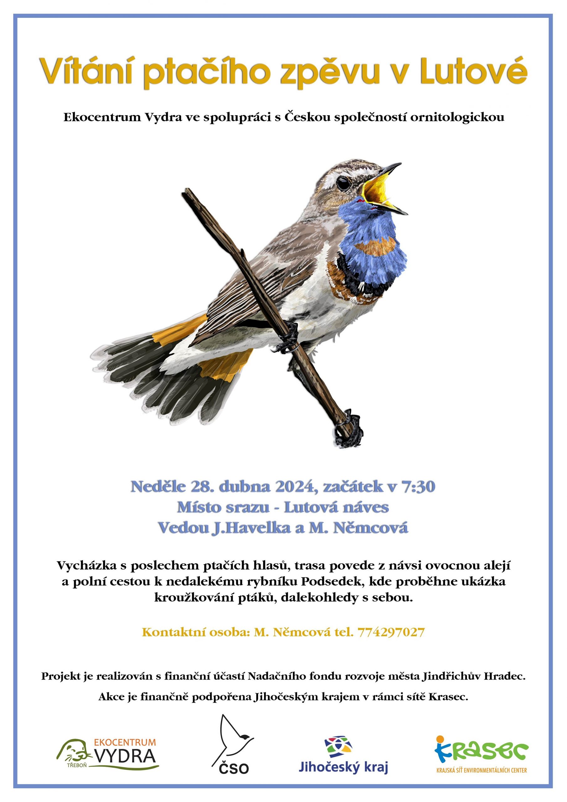 Sraz v sobotu 20. 4. v 8:30 u přístřešku v Panské zahradě. Ukázky odchytů zpěvných ptáků, ukázky odchytových zařízení, hry pro děti, vycházka za ptačím zpěvem do blízkého parku. Vede Jiří Vlček (736 685 672).