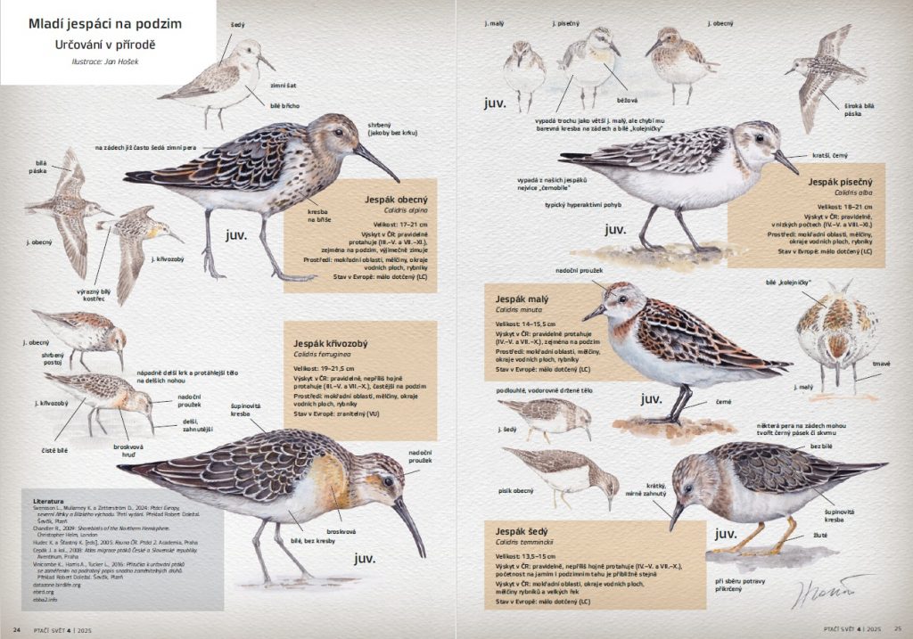 V určovací rubrice Poznáte…? jsme se tentokrát zaměřili na podzimní jespáky. Ondřej Ryška na straně 23 představuje druhy, které během podzimní migrace naším územím pravidelně protahují. Autor radí, kde a jak je nejlépe pozorovat, jak rozpoznat jednotlivé druhy podle velikosti, zbarvení, hlasu i chování, a přibližuje i zajímavosti z jejich podzimního tahu. Článek doprovází dvoustrana detailních ilustrací malíře Jana Hoška.