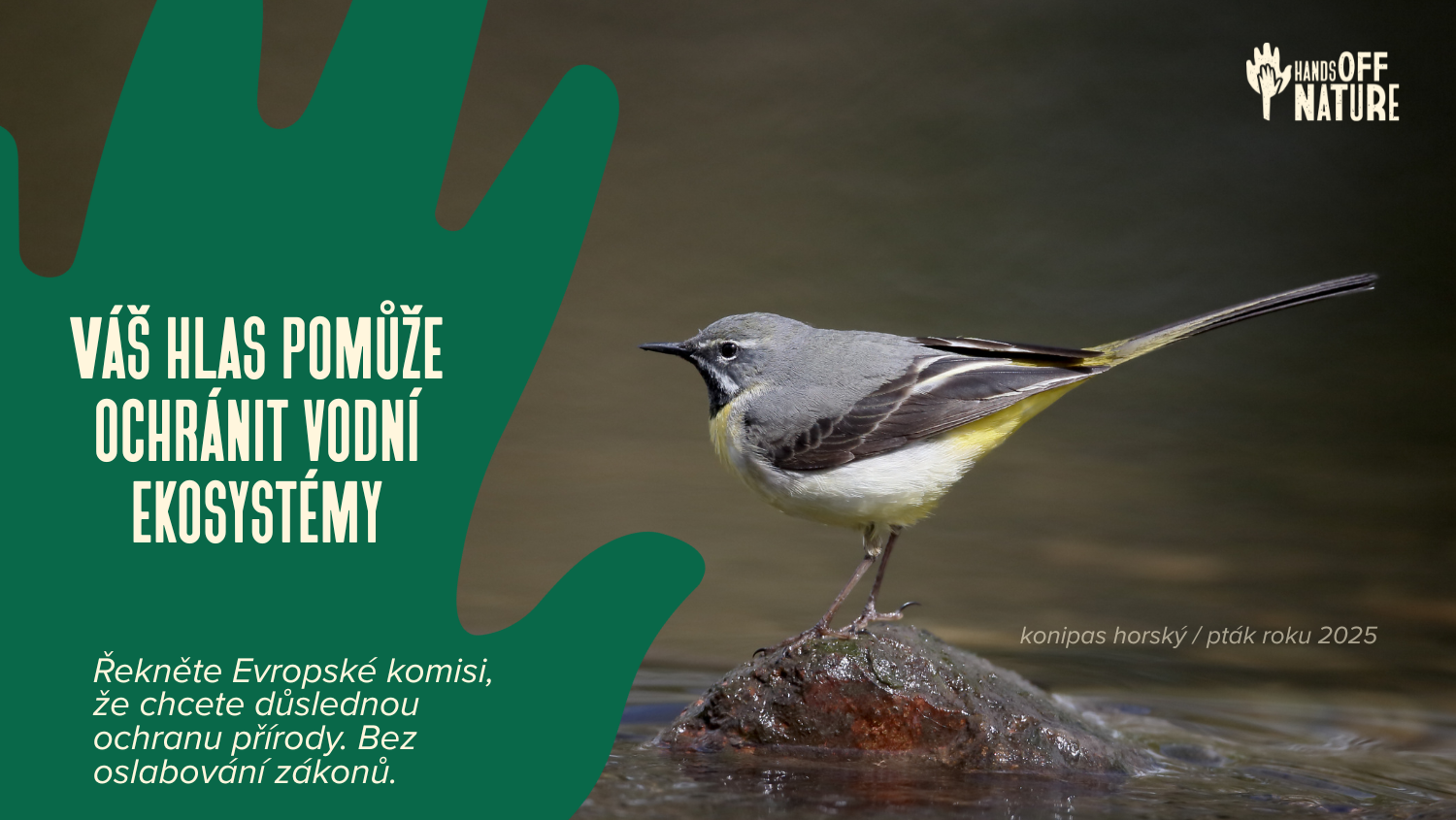 Dnes, 2. února, kdy slavíme Světový den mokřadů, zároveň spouštíme dlouhodobou petici #HandsOffNature proti snahám oslabovat zákony na ochranu životního prostředí. Hlavním tématem petice je voda a její ochrana, jelikož sladkovodní ekosystémy a pitná voda jsou aktuálně v ohrožení a společně s nimi i čápi, chřástali, skorci, čírky, konipasi, potápky, ledňáčci a mnoho dalších..