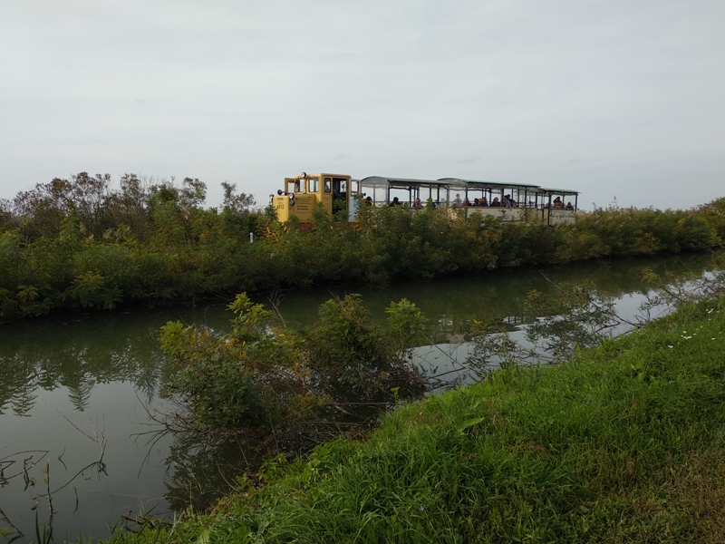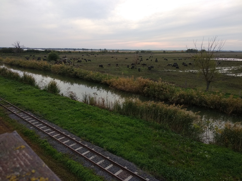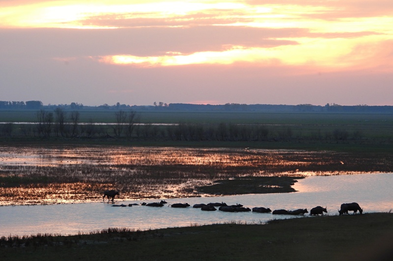 Pak už jsme směřovali k dalšímu vyhlášenému místu, k Hortobágským rybníkům neboli halastó. Jde o rozsáhlou soustavu rybničních ploch a rákosin, které jsou tradičním shromaždištěm nejen jeřábů, ale i hnízdištěm nebo tahovou zastávkou celé řady druhů, pro které soustava vodních ploch v krajině představuje jednoznačný magnet. Je zde další infocentrum s možností nákupu různých suvenýrů a vzhledem k rozlehlosti areálu i malý vláček. Celé dlouhé odpoledne určitě nestačí na prozkoumání každého místa, i tak nám ale nové druhy naskakovaly velmi rychle. Vodní plochy se hemžily zajímavými druhy kachen, brzy jsme objevili lžičáky, ostralky nebo v opravdu velkých počtech čírky, kopřivky či hvízdáky. Nouze pochopitelně nebyla o husy, kterých byly na rybnících a okolí tisíce. Z rákosin se pravidelně ozývali sýkořice, moudivláčci, chřástali vodní a strnadi rákosní. Nechyběli létající drahokamy ledňáčci, velké počty volavek popelavých a bílých, i jedna červená. Na vypuštěných plochách i na podmáčených loukách v okolí nás pochopitelně zaujali bahňáci: jespáci bojovní a obecní, vodouši tmaví, šedí a bahenní, bekasiny otavní, čejky chocholaté, kulíci bledí a velké množství kolih velkých. K tomu stovky racků, kormoránu, špačků a havranů. Člověk opravdu nemohl od žádného místa odtrhnout oči a zároveň musel pořád koukat všude okolo, aby něco zajímavé neprošvihnul. Všichni jsme však postupně po vlastní ose směřovali k rozhledně u rybníka Kondás, kde jsme při nádherném západu slunce, a pozorování působivých vodních buvolů, čekali na večerní slet jeřábů. Ten probíhal severně a západně od rybníků, opět v obrovských počtech, ale větší vzdálenost znamenala umírněnější zážitek, než jsme měli ráno. Úžasný den jsme zakončili „romantickou“ jízdou motorovou úzkokolejkou zpět k informačnímu centru.