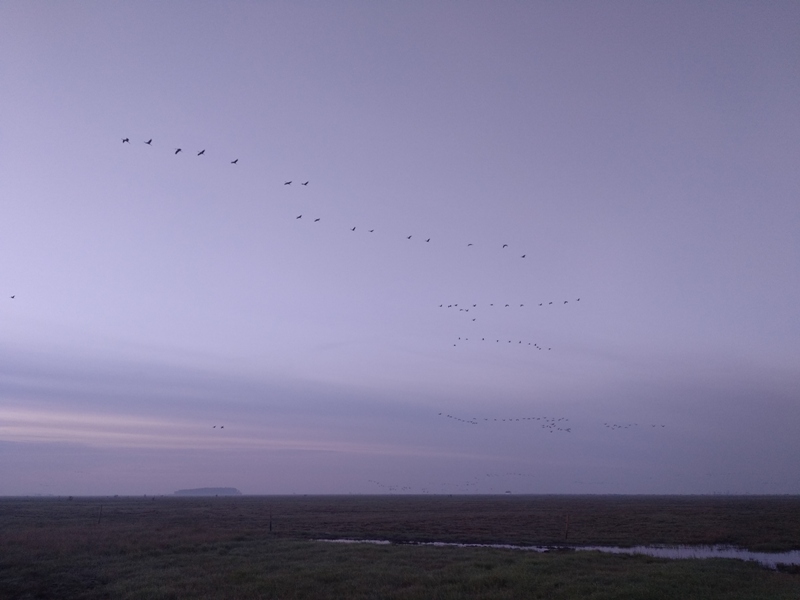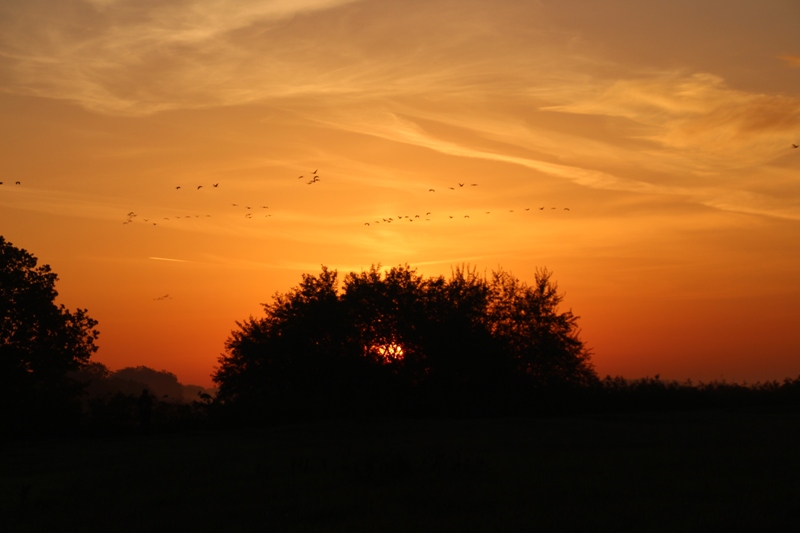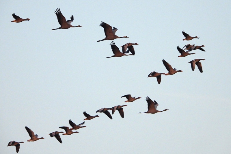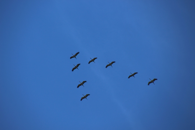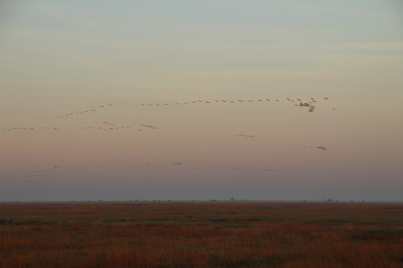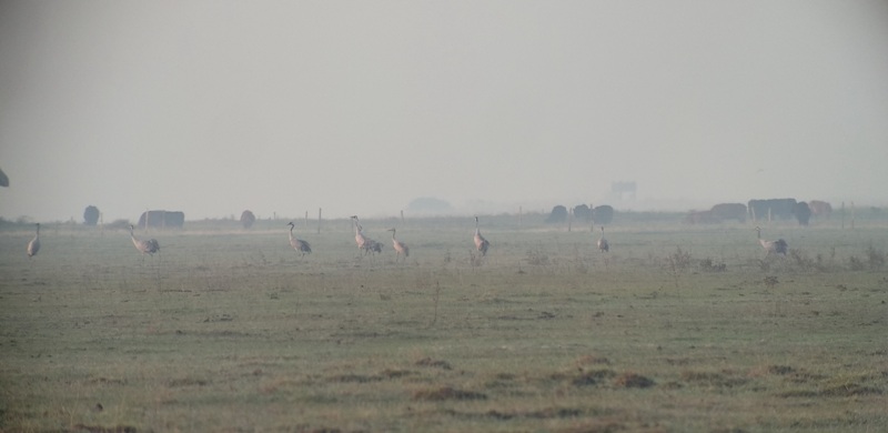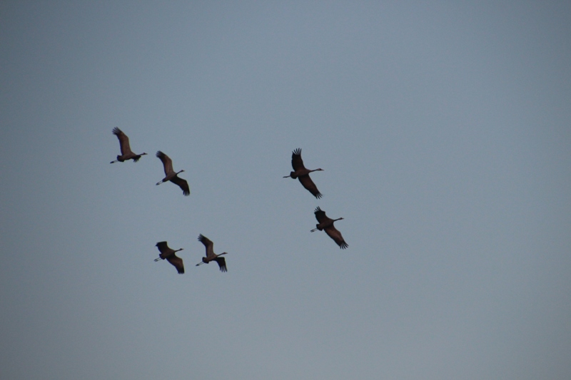 Hned další den ráno jsme již vyráželi za jednou z hlavních atrakcí, tedy za rozletem jeřábů z nocoviště. Měli jsme různé zprávy, že je prý jeřábů letos málo. To se nám ovšem nepotvrdilo. Již při příjezdu na místo pozorování se začali první skupiny objevovat a na samotném místě jsme si pak užívali nekončících proudů těchto nádherných ptáků s jejich typickým voláním, navíc nádherně podkreslené úžasným východem slunce. Hrubým odhadem jsme jich viděli určitě přes 25 tisíc. Vše doplněno o další druhy jako husy, čejky, jespáci a všudypřítomní špačci a havrani. Objevovali se i táhnoucí pěvci jako konipasi a lindušky. Z místa se nám vůbec nechtělo pryč, ale čas byl neúprosný a směřovali jsme zpět na ubytování na vynikající snídani.