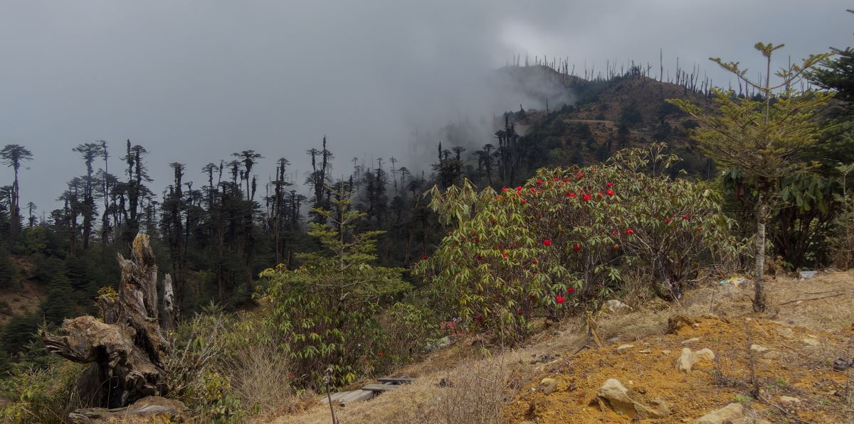 Na vrcholku je nádherný barevný chrám ozdobený stovkami provázků s barevnými vlaječkami a v okolí je dalších 108 menších buddhistických chrámů. Rozsah nadmořských výšek (1 500-3 600m) je důvodem velké biologické rozmanitosti. Ve vyšších oblastech rostou jehličnaté lesy, v nižších je stále zelený tropický prales. Právě v tuto dobu všude kvetly nádherné červené rododendrony a bílé magnólie. Bylo zde velké množství krásných barevných ptáků. Tři druhy drobných něžných chocholáčků – sýkorčí, rezavořitý a proužkohrdlý, několik druhů strdimilů – rudohřbetý, plamenoocasý, několik druhů sojkovců, timálií, suříkovci, cetie a také hýli, strnadi nebo skalníci. V nižším údolí jsme pozorovali chřástala černoocasého (Porzana bicolor).