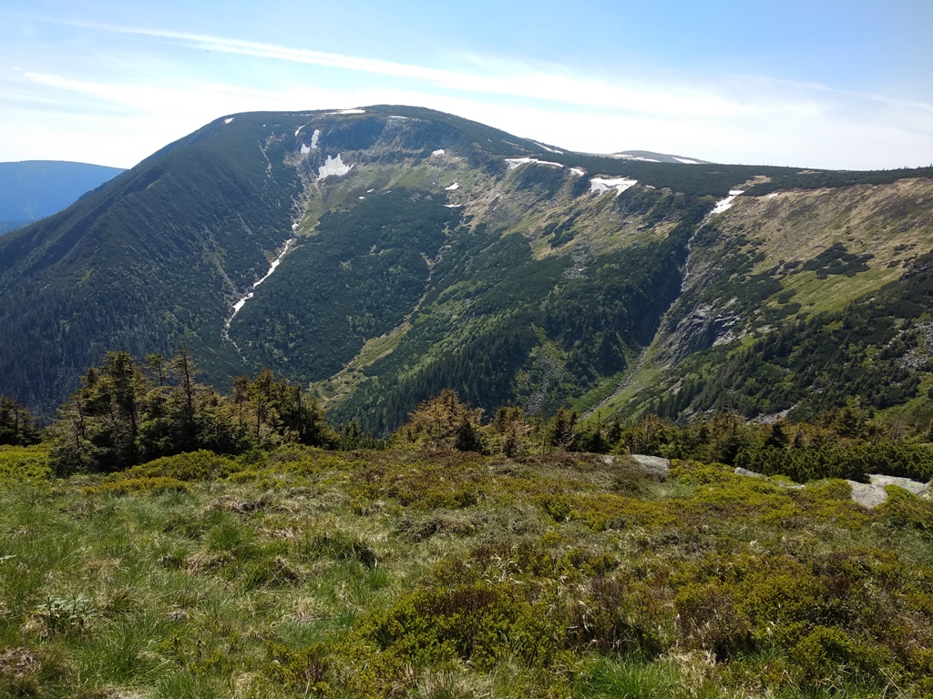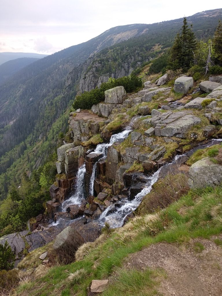 Vydáváme se Obřím dolem dolů. Po cestě objevujeme jednu rostlinu žlutě kvetoucího kuklíku horského a už klesáme. Tak v půli cestě se ozývá červenka obecná a pěnkavy obecné. Zpívají a jejich hlas se nesou údolím a krásně se odráží od skalisek. Když už přicházíme dolů, Hanka nám ukazuje místo, kde můžeme najít rosnatku okrouhlolistou a violku bahenní. Po cestě ještě míjíme krkonošské endemity, a to violky žluté sudetské. Přímo v Peci pod Sněžkou se zadíváme do říčního koryta, zda nespatříme skorce vodního. Bylo by moc příjemné ho vidět. Ovšem to se nám dnes nepoštěstí.