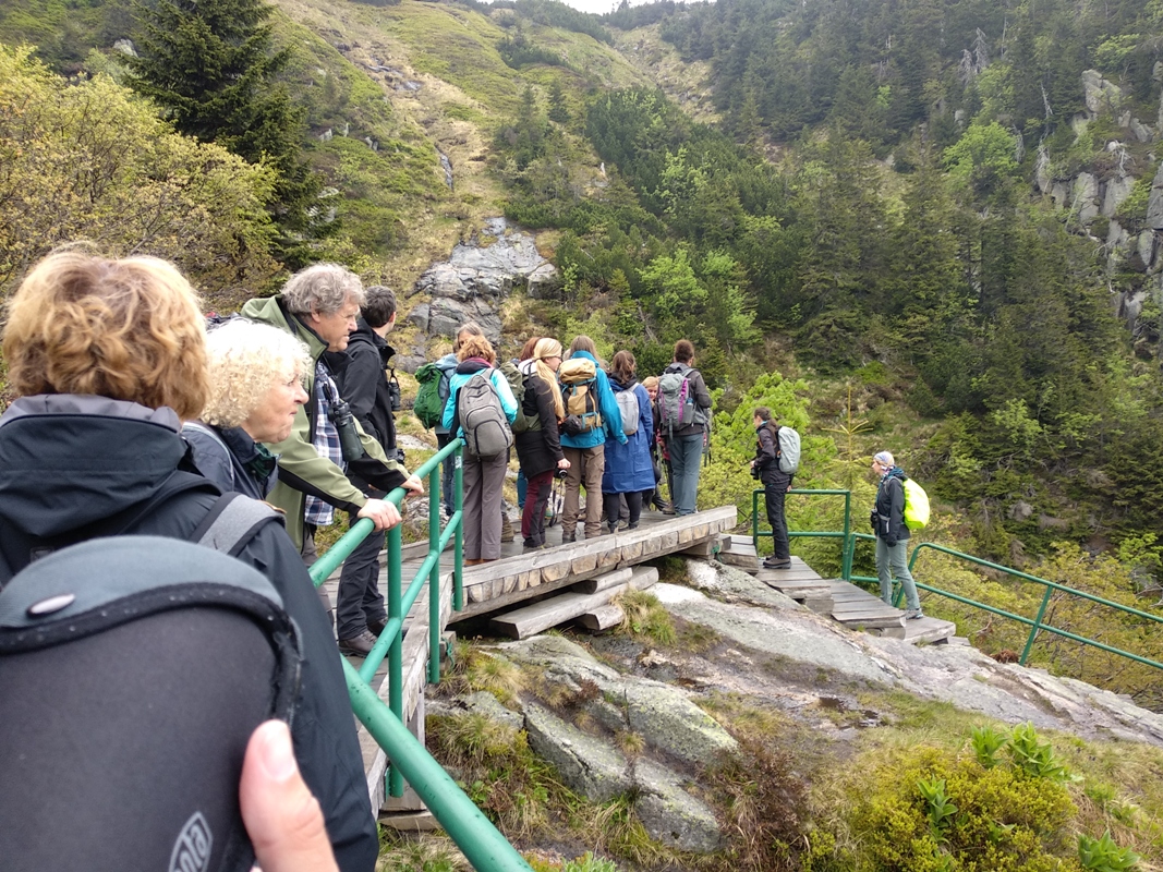 Počasí je mlžné, občas začne kapat, ale nic, co by nás či ptáky rozhodilo. Kolem polétávají a hopkají lindušky luční, ozývají se hýlové obecní a v dálce lze vždy na chvíli spatřit kosy horské. Vypadá to, že to tu mají rozdělené. Kosy horští nalevo od cesty k Labské boudě, hýlové rudí napravo od cesty a křivky, lindušky a budníčci mohou všude. Křivky se nám ukazují v jejich celé parádě. Je tu velké hejno čítající tak 20 jedinců a každý je jinak zbarven, od kanárkově žluté po cihlovou. Obdivujeme nejen ptáky, ale také Pančavský vodopád, nejvyšší vodopád v České republice, na jehož vršku krásně kvetou koniklece alpínské bílé. Po „náročném“ pozorování se jdeme osvěžit a občerstvit do Labské boudy a se ztěžklými nohami se jdeme podívat na Labský vodopád. Od Hanky se dozvídáme, že v minulosti zde byla zadržovací nádrž a stavidla, a když se nashromáždil potřebný počet návštěvníků, pustila se stavidla, aby vodopád působil majestátněji. Kousek od vodopádu nám Hanka ukazuje příležitostně masožravou rostlinu, tučnici obecnou. A teď už nás čeká stoupání až ke Sněžným jámám. Cestou se noříme do neprostupné mlhy. Údajně se tu vyskytuje bělořit šedý. Určitě tu nějaký je, my ho ale v té mlze hledáme marně.