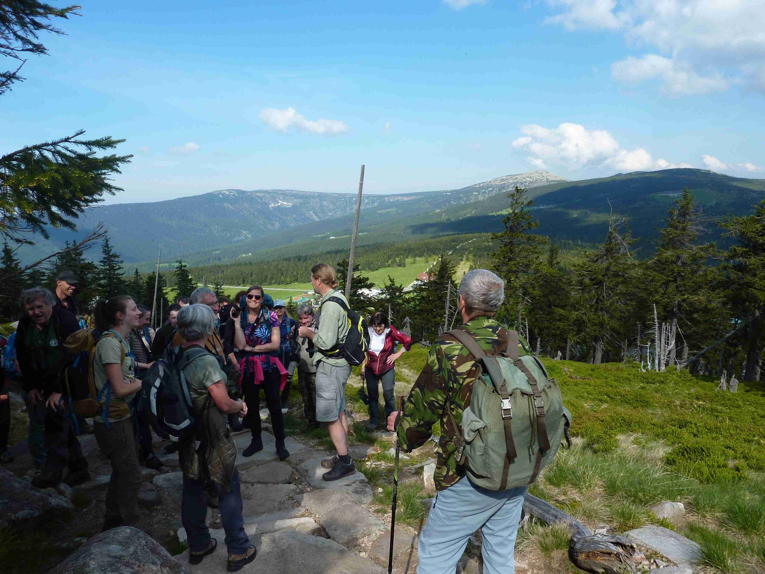 Jdeme polskou částí Krkonoš. Provází nás zpěv, pro nás nepřekvapivě, budníčka většího. Zahlédneme pěvušku modrou. Sluníčko žhne, musíme se namazat opalovacím krémem. Přes cestu nám přelétá čečetka zimní a usedá na vršek smrku, odkud zpívá. Jožku napadne, že bychom se s ní mohli vyfotit. Je to taková idylka, skupinové foto a s čečetkou zimní nad námi. Sehnat celou ornitologickou partu dohromady a domluvit se s čečetkou, aby počkala, než se naaranžujeme, si bere na starost Jožka. Sýr, a je to.