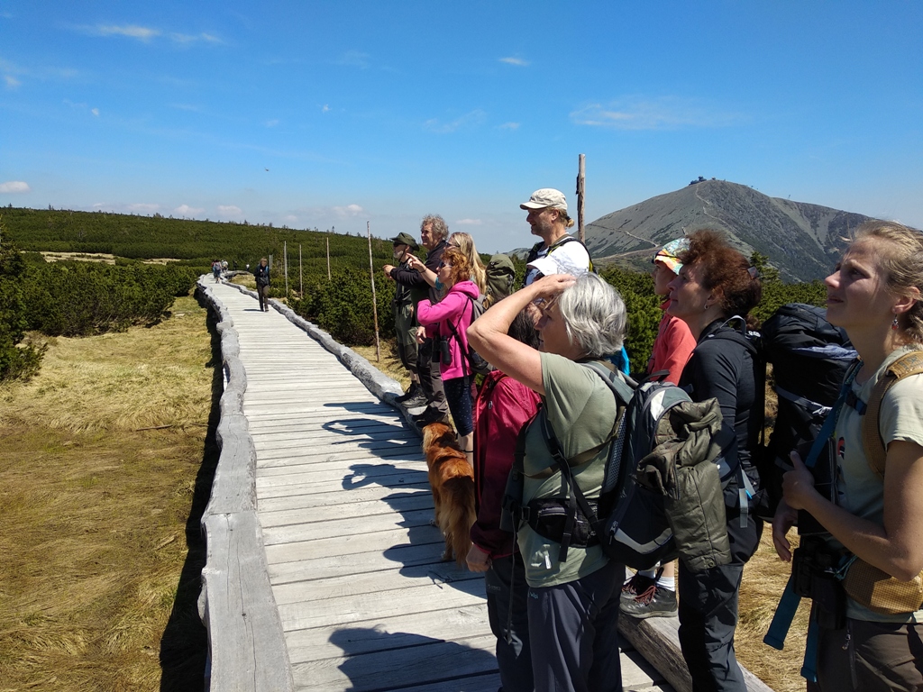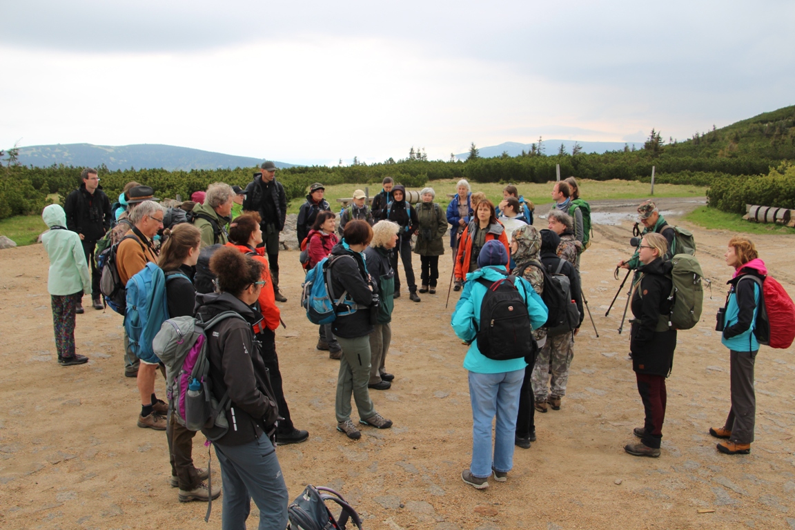 Náš první sobotní okruh vede z Horních Míseček přes Vrbatovu boudu na Labskou boudu. Odtud do Polska na Sněžné jámy a přes pramen Labe a Harrachovy kameny zpátky na Vrbatovu boudu a do Horních Míseček. Ráno nás přivítá Kuba Hlaváček, nadšený ornitolog, Kája Mikslová, také nadšená ornitoložka, která nyní pracuje pro Správu Krkonošského národního parku, a Hanka Trachtulcová, zapálená průvodkyně přírodou Krkonoš. Zdá se, že o přísun kvalitních informací je velice dobře postaráno. Pro případ, že by měl někdo z nás té ornitologie už dost, může se libovolně přeorientovat třeba na botaniku, geologii či historii.