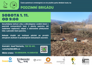 Přijďte pomoc na pravidelnou podzimní brigádu se zazimováním parku. Čekají nás především výřezy, úklid biomasy či opravy ohradníku. Nebude však chybět pozorování ptáků a dalších živočichů a povídání o parku u ohně.