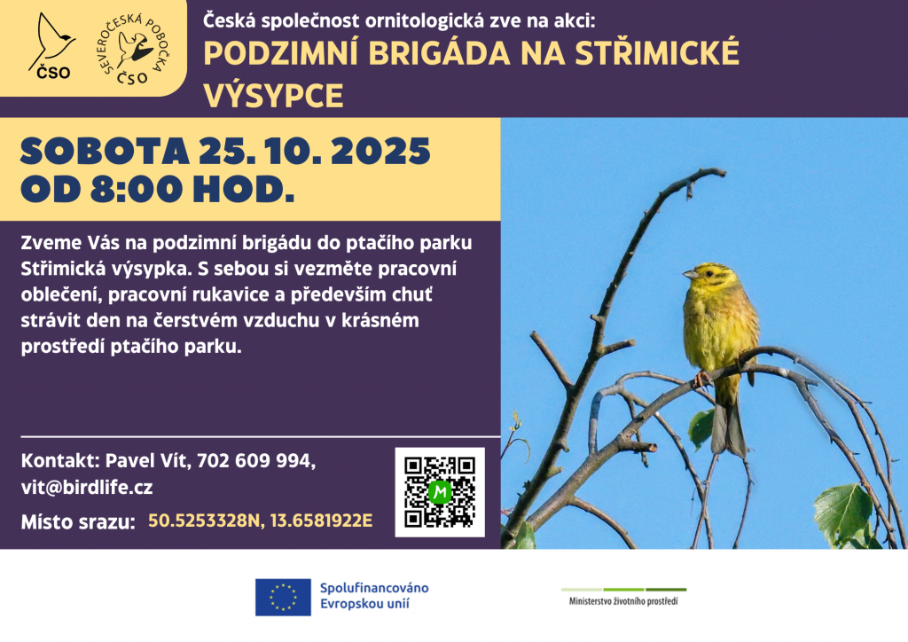Zveme vás na podzimní brigádu do ptačího parku Střimická výsypka. Pokud si chcete před zimou ještě trochu protáhnout tělo při úklidu ploch od větví invazní hlošiny, nebo při výsadbě nových ovocných stromů, rádi se s vámi uvidíme v sobotu 25.10.2025. Sraz je v 8 hodin na parkovišti u hlavního vstupu do parku (viz. souřadnice). Konec brigády je plánovaný na 15 hodin, ale je samozřejmě možné v případě potřeby odejít kdykoli v průběhu dne. Po práci pak na všechny účastníky čeká opékání buřtíků. S sebou si vezměte pracovní oblečení, pevnou obuv a pracovní rukavice. Těšíme se na Vaši účast.