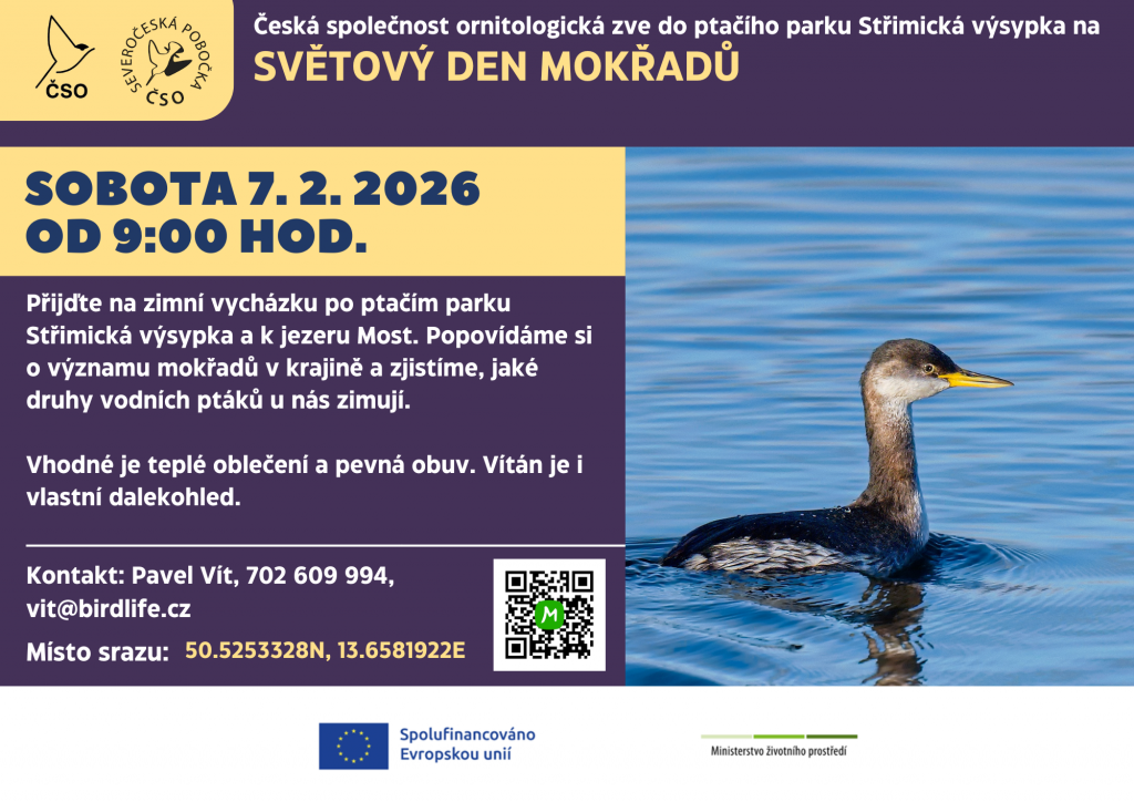 Zveme vás do ptačího parku Střimická výsypka na zimní procházku ke Světovému dni mokřadů. Tématem povídání bude především význam mokřadních a vodních ploch v krajině a na řadu přijde i pozorování zimujících vodních ptáků na jezeře Most.