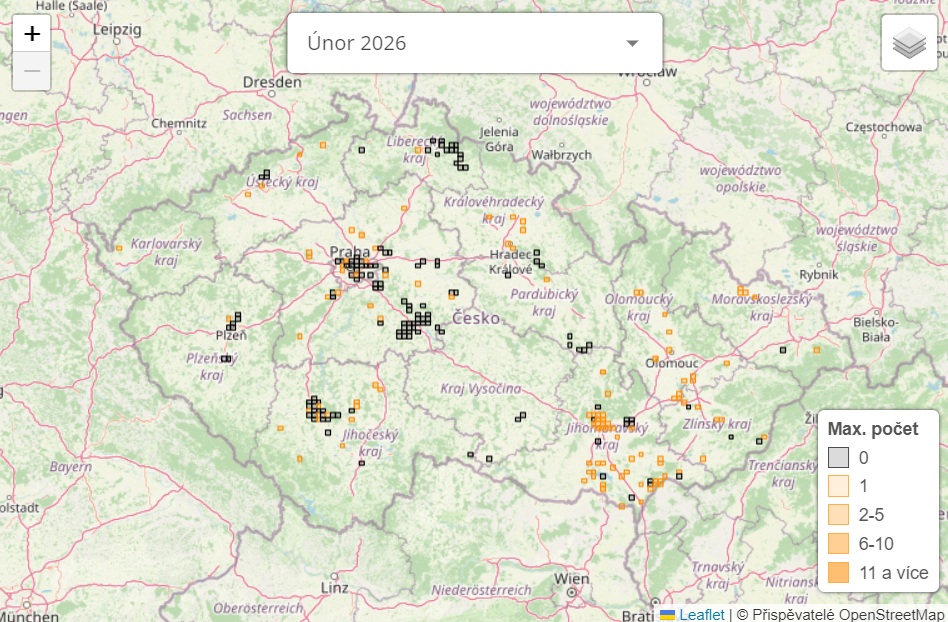 S koncem února se uzavřela třetí sezona mapování přezimujících rehků domácích. Ačkoli se v posledním měsíci nepodařilo dobýt tolik čtverců jako v prosinci a lednu, díky vytrvalosti mapovatelů jsme i tak získali cenná data o jejich početnosti. Celkem 110 dobrovolníků zapsalo během února 377 pozorování a dobylo 251 čtverců. Rehek byl zaznamenán ve 114 z nich, zatímco zbylých 137 bylo bez rehka. Maximální počet jedinců zaznamenaných v jednom čtverci se tentokrát zastavil na čísle šest.