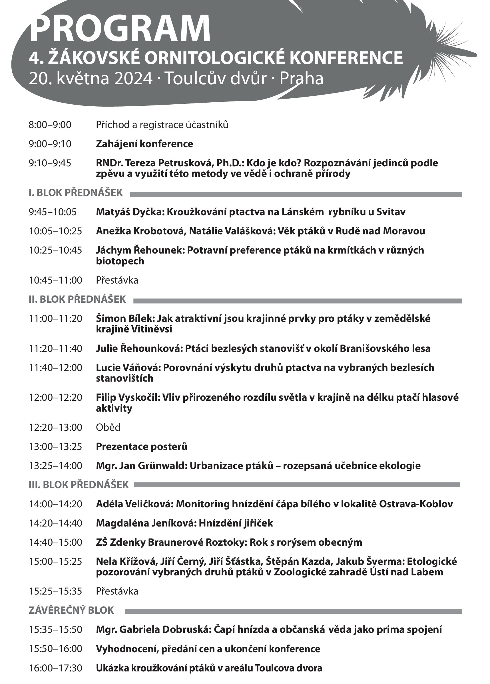 V pondělí 20. května 2024 Česká společnost ornitologická (ČSO) uspořádala v pražském Toulcově dvoře čtvrtý ročník žákovské ornitologické konference, tedy akce kde jednotlivci i badatelské týmy prezentují výsledky své ornitologické práce formou posteru či ústní prezentace. ČSO akci organizuje jednou za dva roky.