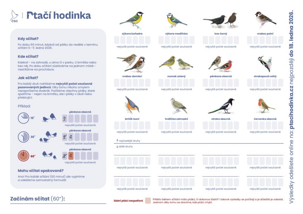 Zapisujeme všechny ptáky, které vidíme ve svém zorném poli. „Tedy nejen ty, kteří přilétli na krmítko, ale i ty, kteří sedí opodál na plotě nebo jen přeletují. Sčítání si můžeme zjednodušit, když na webu ptacihodinka.cz spustíme časomíru a počty zapisujeme rovnou do formuláře. Další možností je nejprve zapisovat záznam na papír či pomocný sčítací arch s kresbami ptáků, který nám sčítání usnadní. Po elektronickém odeslání výsledků pozorovatelé získají originální certifikát s profilem jejich krmítka,” sděluje Tuháček a upozorňuje, že výsledky Ptačí hodinky je potřeba odeslat nejpozději do neděle 18. ledna 2026.