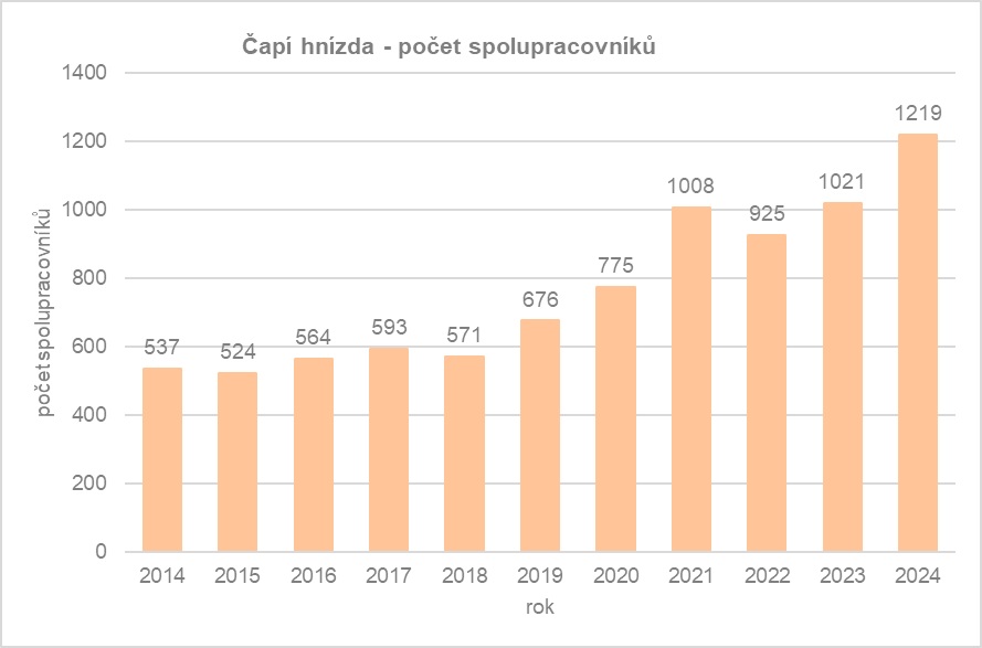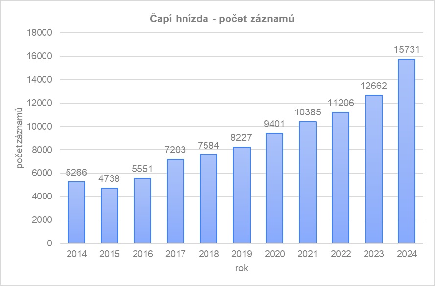 Počet spolupracovníků se od té doby více než zdvojnásobil (viz Graf 1). S jejich narůstajícím počtem roste i počet záznamů v databázi (Graf 2) – během 11 let jsme do databáze vložili více než 97 000 záznamů o hnízdění čápů bílých na území celé republiky. Tak jedinečný datový soubor bylo možné získat pouze díky spolupráci s velkým množstvím spolupracovníků.